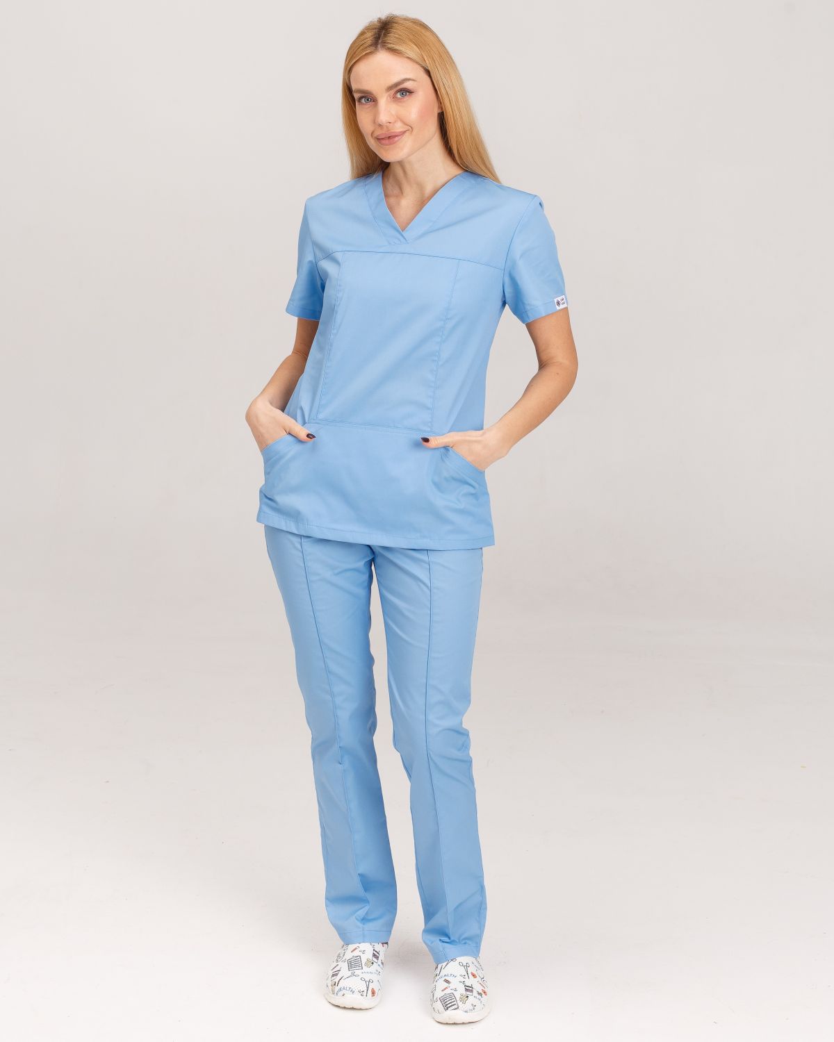 Купить женский медицинский костюм можете как с однотонной, так и с принтованной медицинской рубашкой, или же дополнить его тематической вышивкой, или индивидуальным рисунком ручной работы.