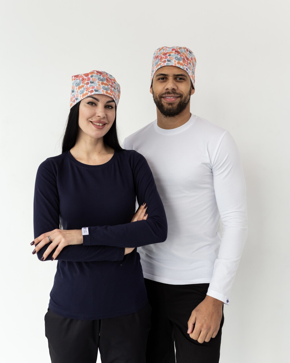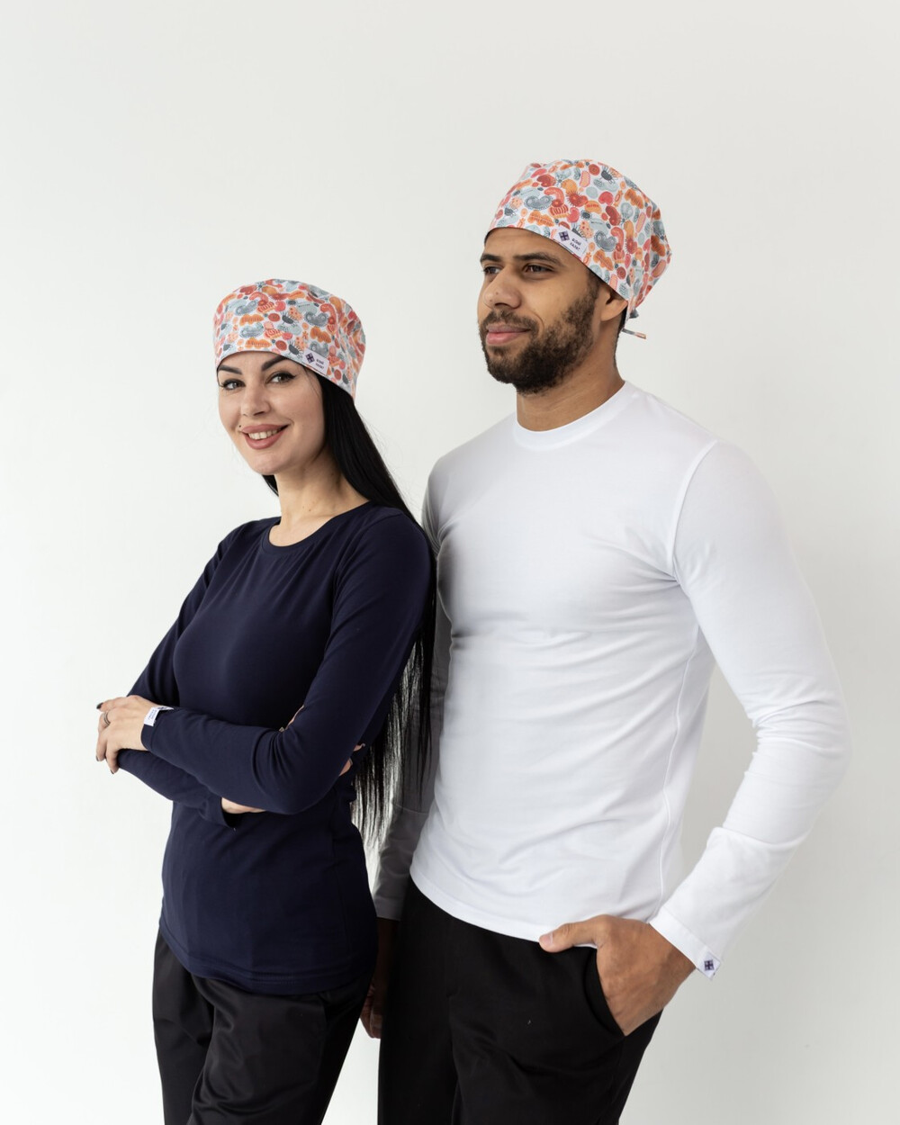 Наши медицинские шапочки не теряют цвета после многократных стирок, могут быть однотонные и принтованные. Они декорированы накладной планкой и брендированной нашивкой. Сзади — завязки, которыми легко регулировать посадку.