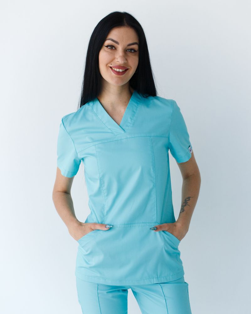 Однотонный медицинский верх «Топаз» — это оптимальная одежда для врачей, которые ценят удобство униформы наравне с современным фасоном.