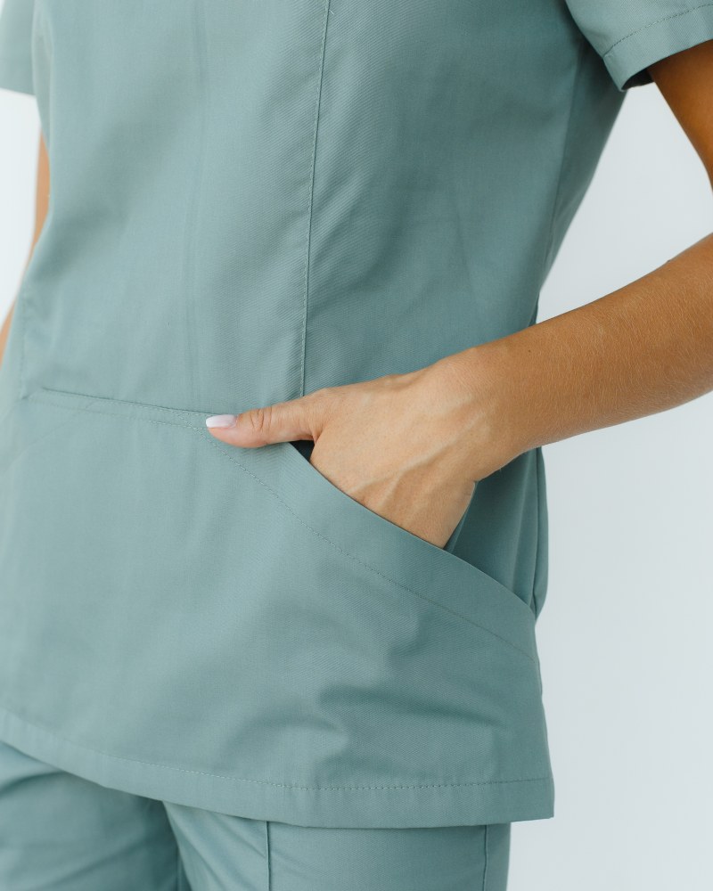 Однотонный медицинский верх «Топаз» — это оптимальная одежда для врачей, которые ценят удобство униформы наравне с современным фасоном.