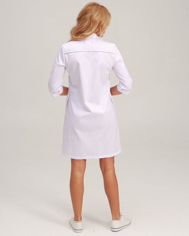 А-силуэт медицинского халата женского обеспечивает комфорт в течении дня. Спинка изделия декорирована кокеткой с кантом из ткани контрастного цвета.