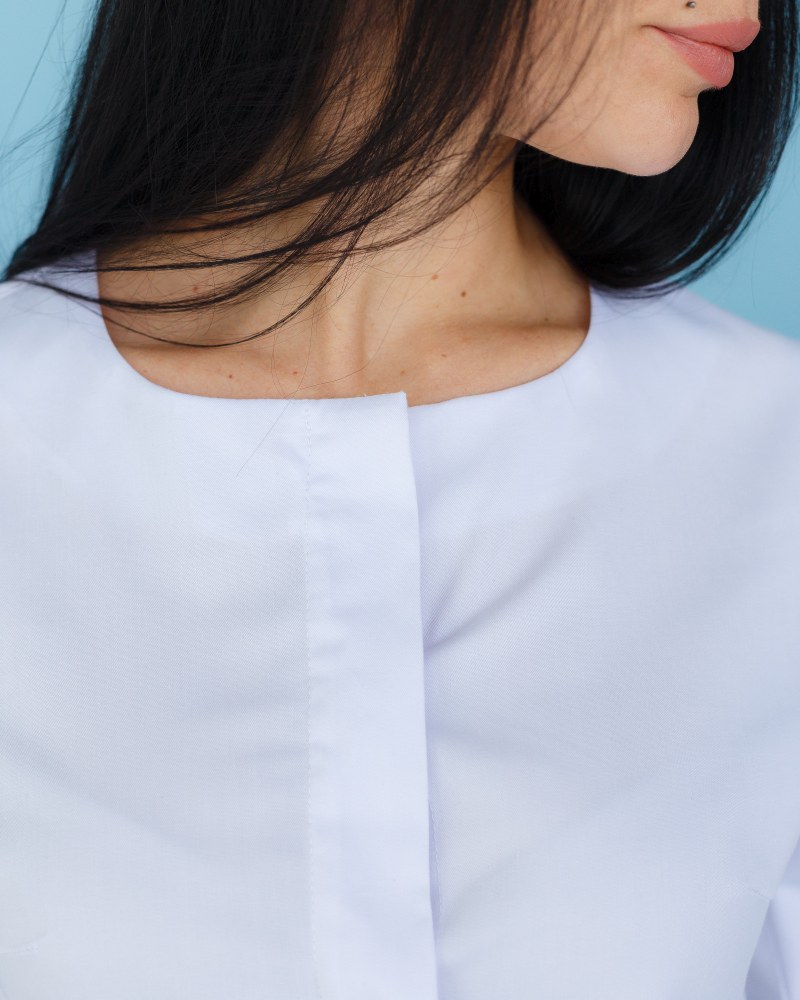 Полуприталенный халат длиной до колен. Практичная длина рукава 7/8, левый рукав декорирован брендированной нашивкой. Халат застегивается на ряд потайных пуговиц, вырез горловины - в форме полулодочки. Имеется 2 кармана.