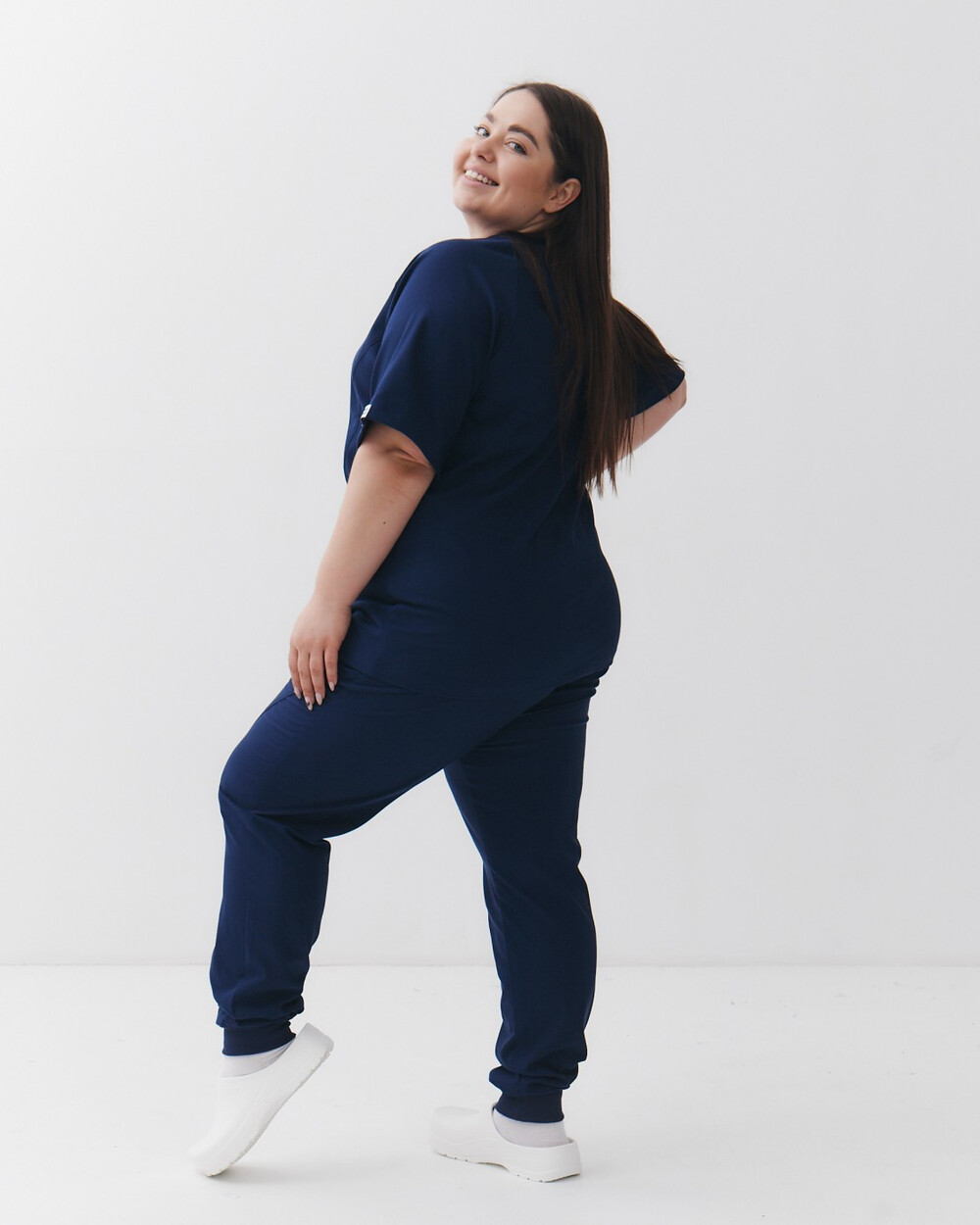 V-образный вырез рубашки, джогер на удобной резинке с завязками, удобная длина изделий. Важное из преимуществ — эластичная ткань премиум сегмента, которая не мнется и тянется во все стороны.