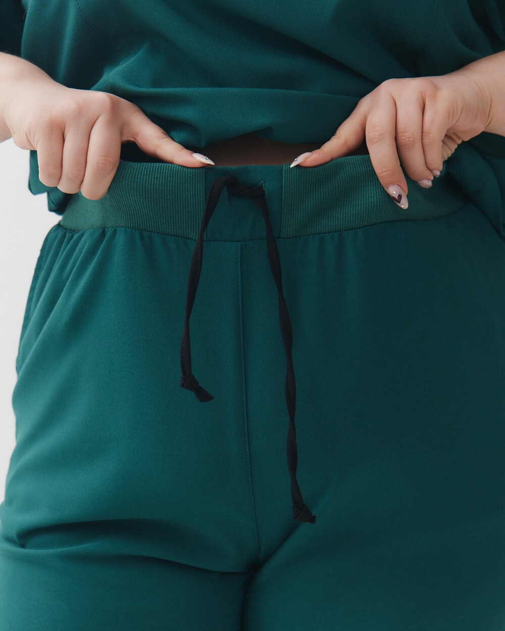 V-образный вырез рубашки, джоггеры на удобной резинке с завязками, удобная длина изделий. Важное из преимуществ — эластичная ткань премиум сегмента, которая не мнется и тянется во все стороны.