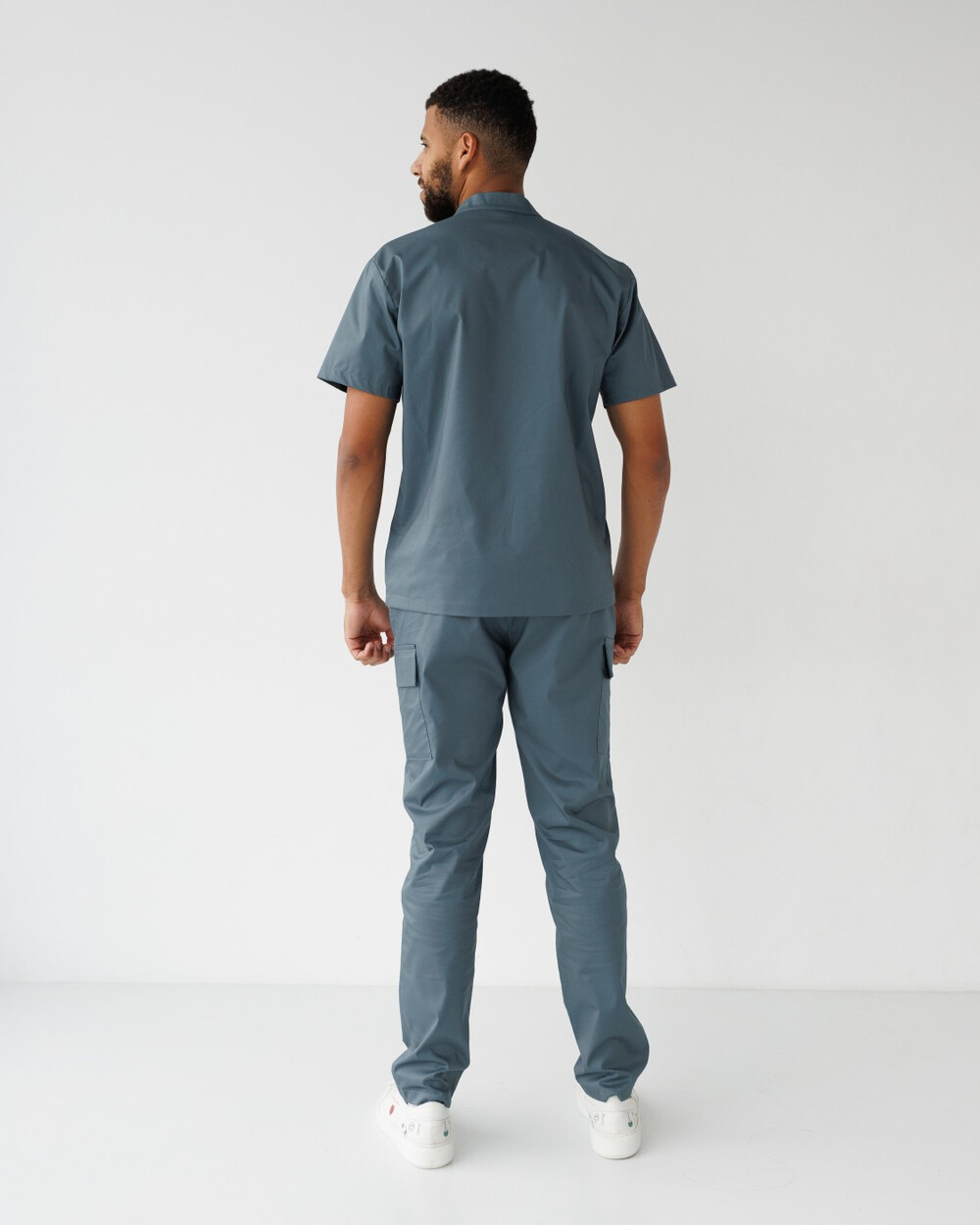 Штаны медицинского костюма мужского DENVER (Денвер) заслуживают особенного внимания. Фасон карго для медицинской мужской униформы — это смелое и практичное решение. Штаны карго, слегка зауженные к низу, позволяют активно двигаться в течении длительных рабочих смен. Средняя высота посадки и вшитая широкая эластичная резинка не сковывает движений, не передавливает. Декоративный гульфик на лицевой стороне медицинских брюк мужских костюма DENVER (Денвер) добавляет образу сдержанности. Штаны дополнены четырьмя вместительными карманами: два втачных выше, под эластичной резинкой, и два накладных ниже линии бедра. Накладные карманы закрываются клапаном.