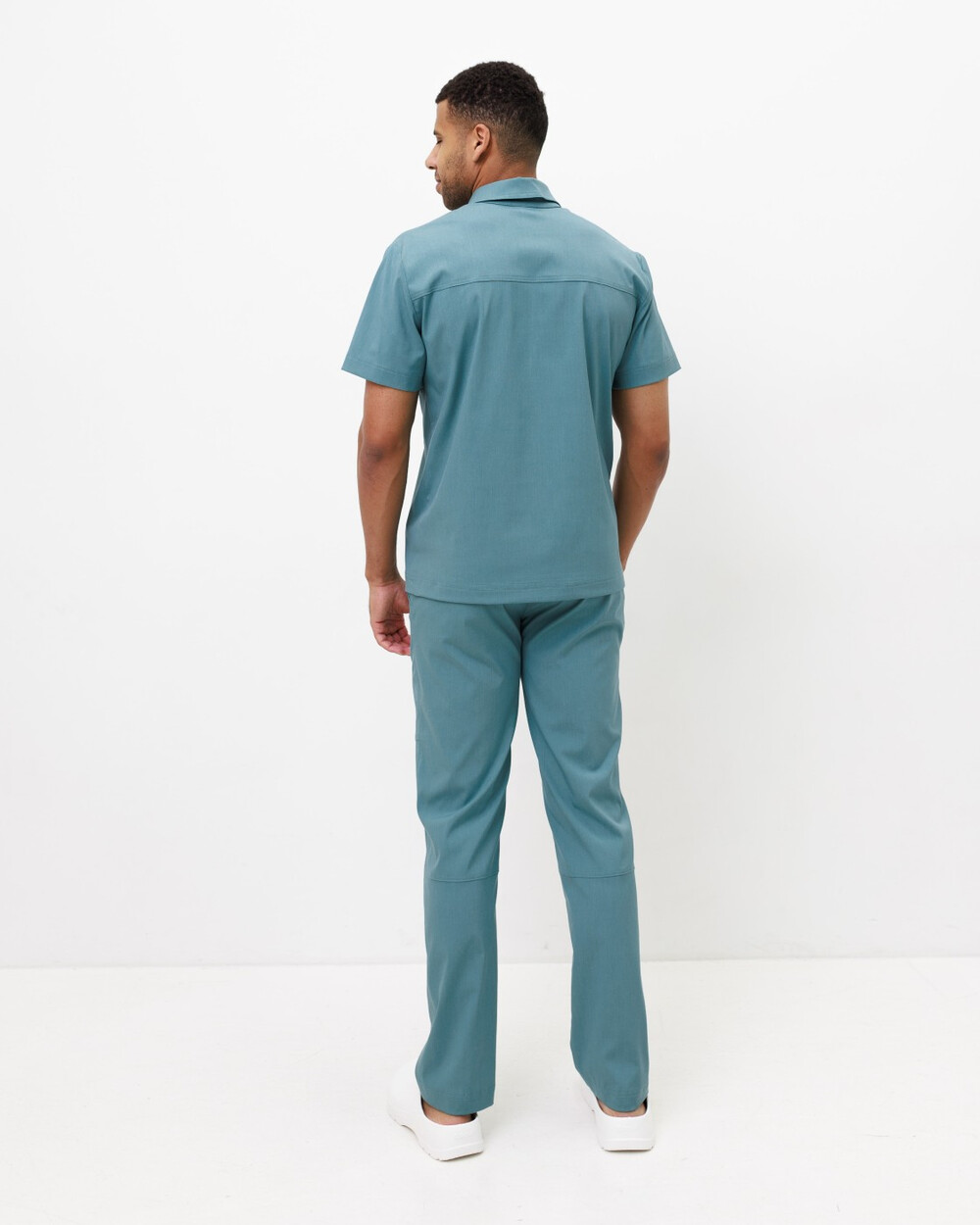 Мужской костюм свободного силуэта. Рубашка с классическим воротничком на стойке с застежкой поло. На рубашке с левой стороны есть накладной зашитый карман, после стирки он становится функциональным. Рукава – короткие.