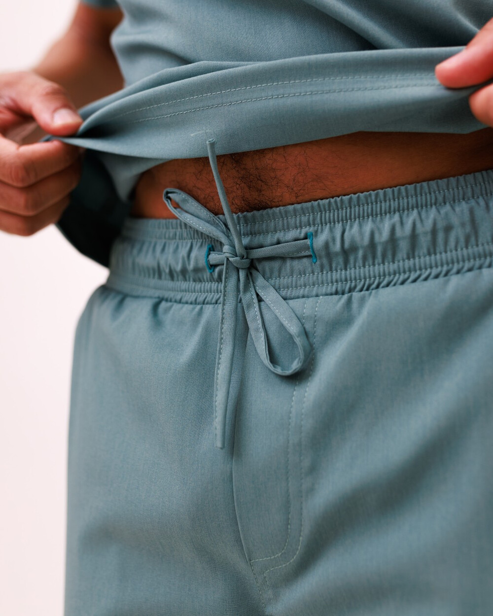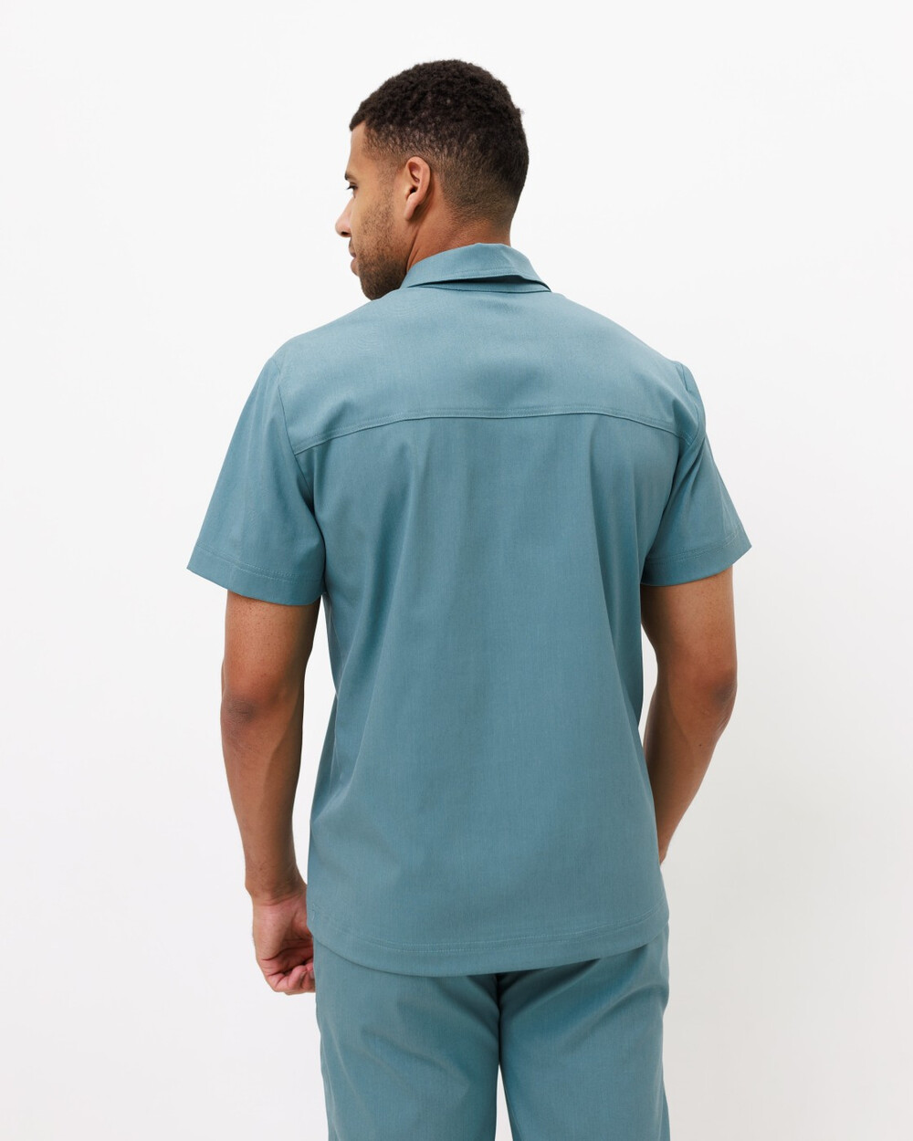 Мужской костюм свободного силуэта. Рубашка с классическим воротничком на стойке с застежкой поло. На рубашке с левой стороны есть накладной зашитый карман, после стирки он становится функциональным. Рукава – короткие.