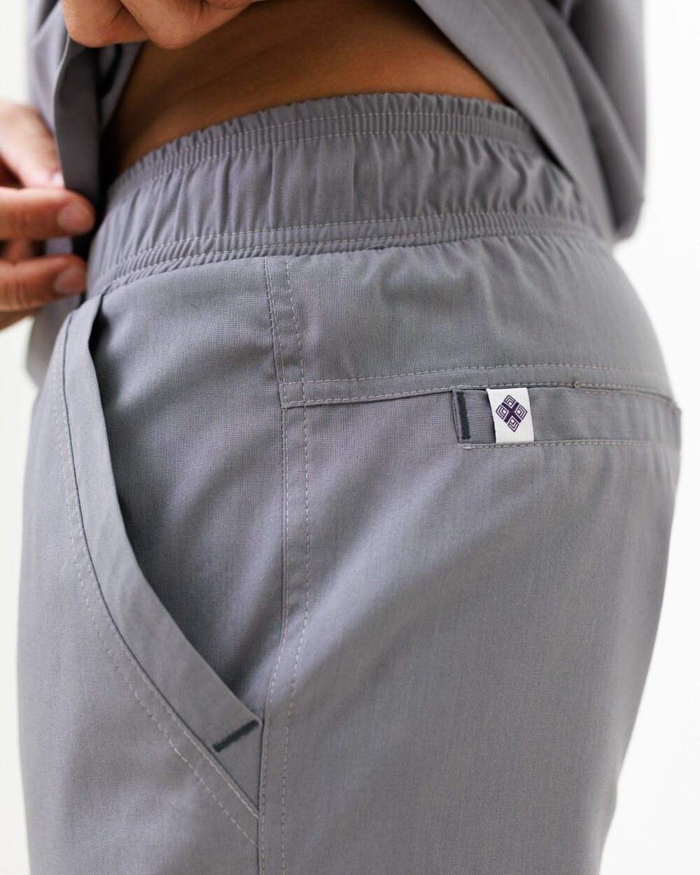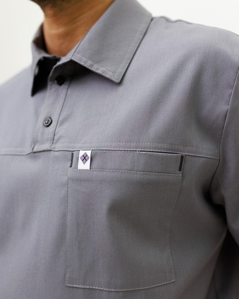 Мужской костюм свободного силуэта. Рубашка с классическим воротничком на стойке с застежкой поло. На рубашке с левой стороны есть накладной зашитый карман, после стирки он становится функциональным. Рукава – короткие.