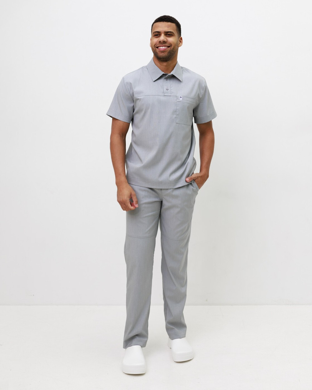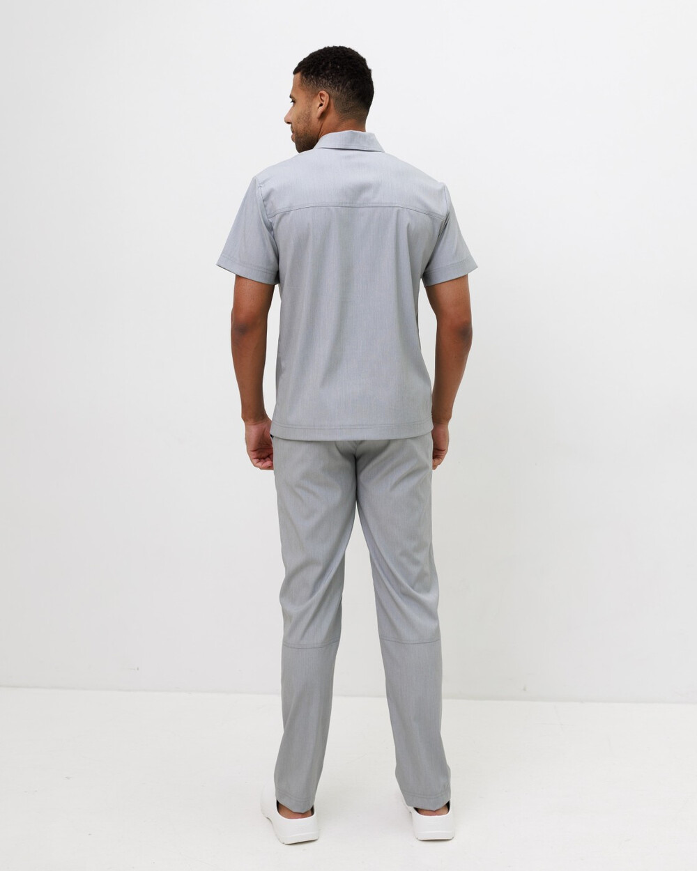 Мужской костюм свободного силуэта. Рубашка с классическим воротничком на стойке с застежкой поло. На рубашке с левой стороны есть накладной зашитый карман, после стирки он становится функциональным. Рукава – короткие.