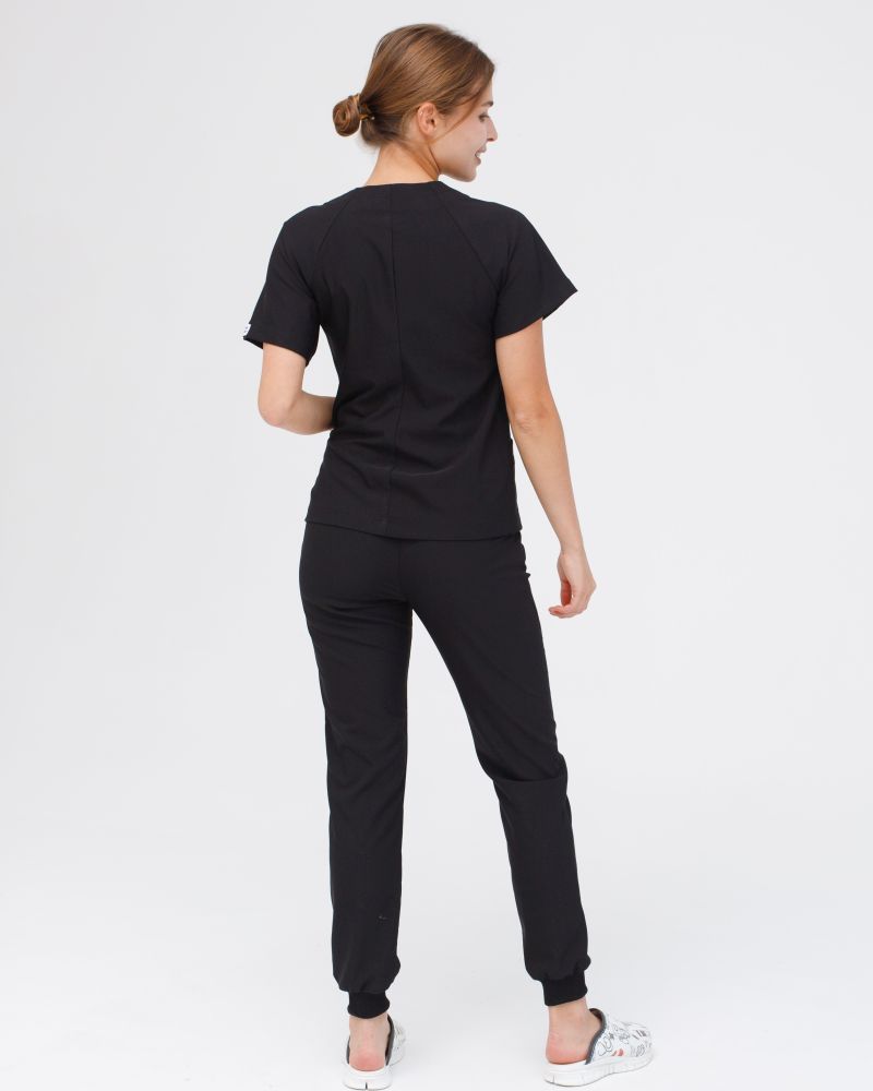V-образный вырез рубашки, джоггеры на удобной резинке с завязками, удобная длина изделий. Важное из преимуществ — эластичная ткань премиум сегмента, которая не мнется и тянется во все стороны.