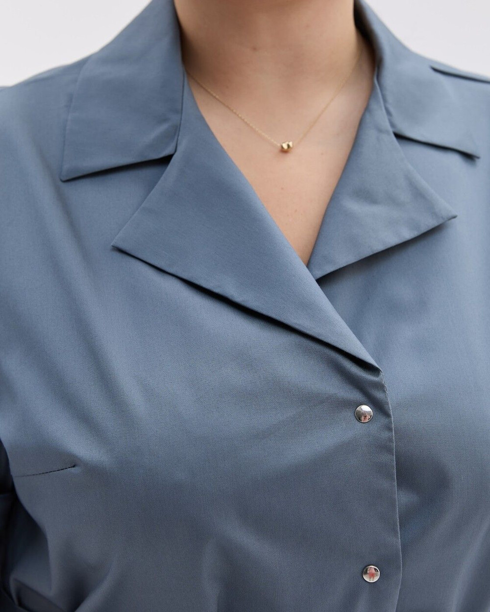 Рубашка в стиле сафари с отложным воротничком, застегивается на кнопки и имеет пояс. Длина рукава регулируется с помощью фиксирующей паты на кнопке. Брюки заужены к низу и имеют карманы.