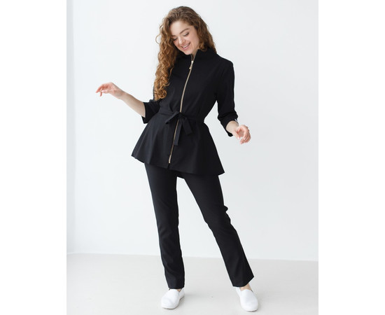 Костюм женский медицинский «Мишель» состоит из медицинской рубашки и брюк прямого фасона. Рубашка с рукавами 3/4 имеет оригинальный дизайн: широкая баска подчёркивает пропорциональность фигуры, а молния золотого цвета выступает контрастным акцентом. Есть два вместительных кармана. Низ — брюки прямого фасона на резинке. В комплекте есть пояс-завязка, чтобы ещё больше подчеркнуть талию.