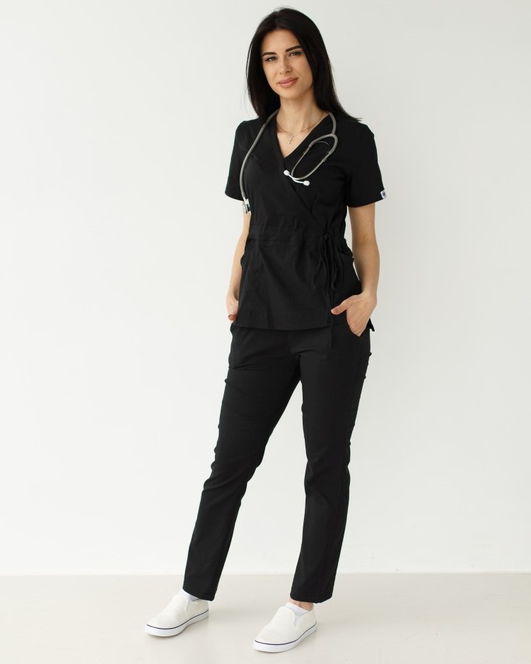 Костюм состоит из медицинской рубашки с коротким рукавом и зауженных штанов. Рубашка с имитацией запаха имеет пояс-завязку. Такой крой акцентирует фигуру, не ограничивая движения. Штаны на эластичной резинке дополнены вместительными карманами.