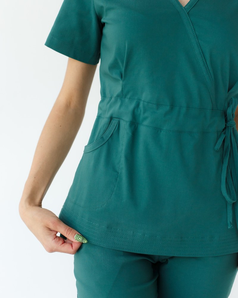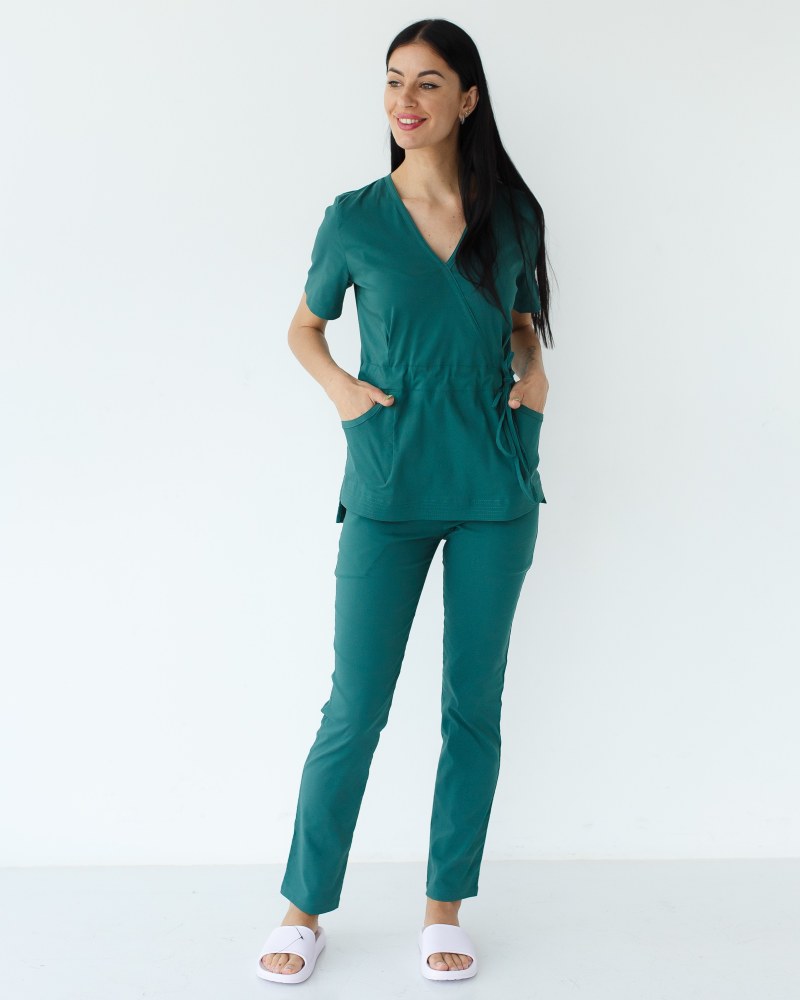 Костюм состоит из медицинской рубашки с коротким рукавом и зауженных штанов. Рубашка с имитацией запаха имеет пояс-завязку. Такой крой акцентирует фигуру, не ограничивая движения. Штаны на эластичной резинке дополнены вместительными карманами.