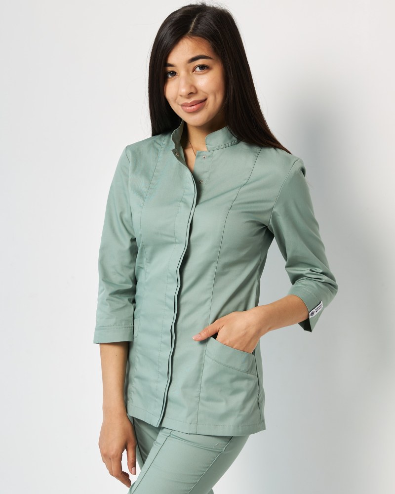 Медицинский женский костюм «Сакура» состоит из удлиненной медицинской рубашки и прямых брюк. Приталенная рубашка на потайных кнопках с четвертым рукавом и воротником-стойкой подчеркивает фигуру, не сковывая движения. Есть два практичных втачных кармана. Рубашка дополнена контрастной декоративной вставкой возле кнопок. Брюки – прямого фасона, на резинке, с декоративной строчкой на лицевой стороне.