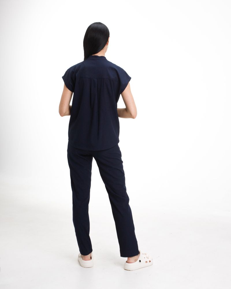 Рубашка свободного кроя с короткими рукавами и горловиной-стойкой на пуговицах. Есть 3 кармана — один нагрудный и два в области талии. Брюки свободного кроя с двумя карманами.
