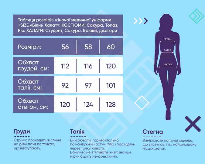 Женский медицинский костюм «Топаз» +SIZE — бестселлер линии «+SIZE» из ассортимента бренда медицинской одежды «Белый Халат». Мед костюм женский «Топаз» +SIZE подойдет для врачей, младшего медицинского персонала и представителей индустрии красоты. Это медицинская униформа женская, которая уместно выглядит как на приеме пациентов, во время длительной рабочей смены и даже на профильной конференции. Женский хирургический костюм «Топаз» +SIZE для наших покупателей стал синонимом удобства и практичности, а также безупречного внешнего вида.