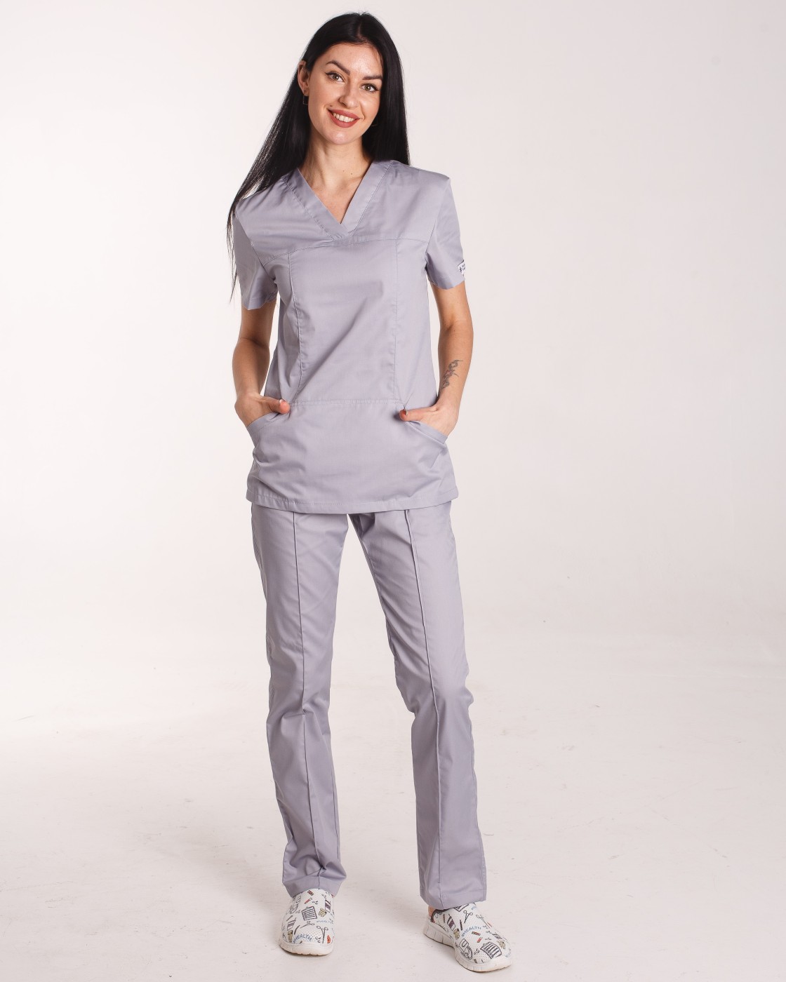 Купить женский медицинский костюм можете как с однотонной, так и с принтованной медицинской рубашкой, или же дополнить его тематической вышивкой, или индивидуальным рисунком ручной работы.