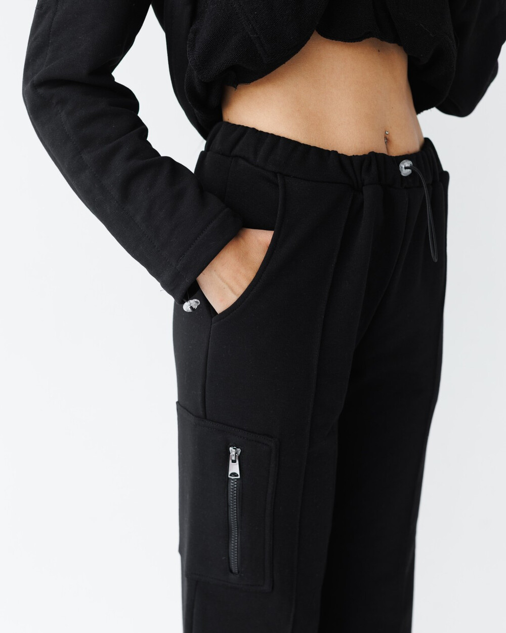 Брюки длинные, прямые со стрелками, с правой стороны расположен накладной карман с молнией. Пояс пришивной, с резинкой и фиксаторами.