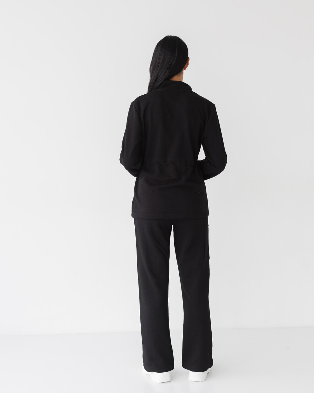 Костюм полуприлегающего силуэта, изготовлен из трикотажного полотна-петли. Кофта с длинными рукавами, стойкой воротником, застегивается на молнию, есть карманы и кулиска с резинкой и фиксатором на талии и рукавах.