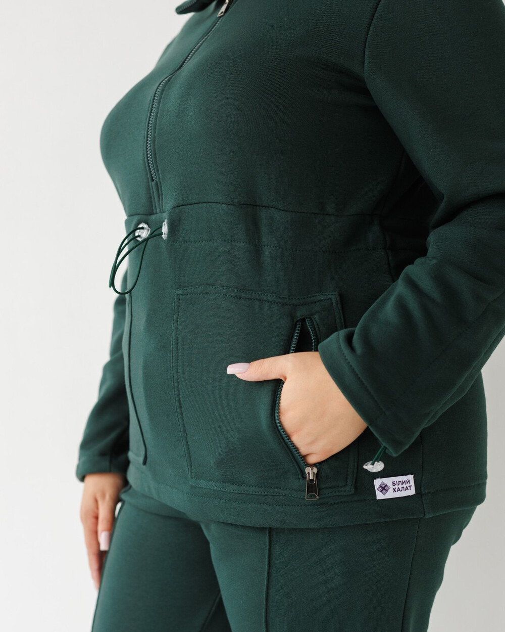 Костюм полуприлегающего силуэта, изготовлен из трикотажного полотна-петли. Кофта с длинными рукавами, стойкой воротником, застегивается на молнию, есть карманы и кулиска с резинкой и фиксатором на талии и рукавах.