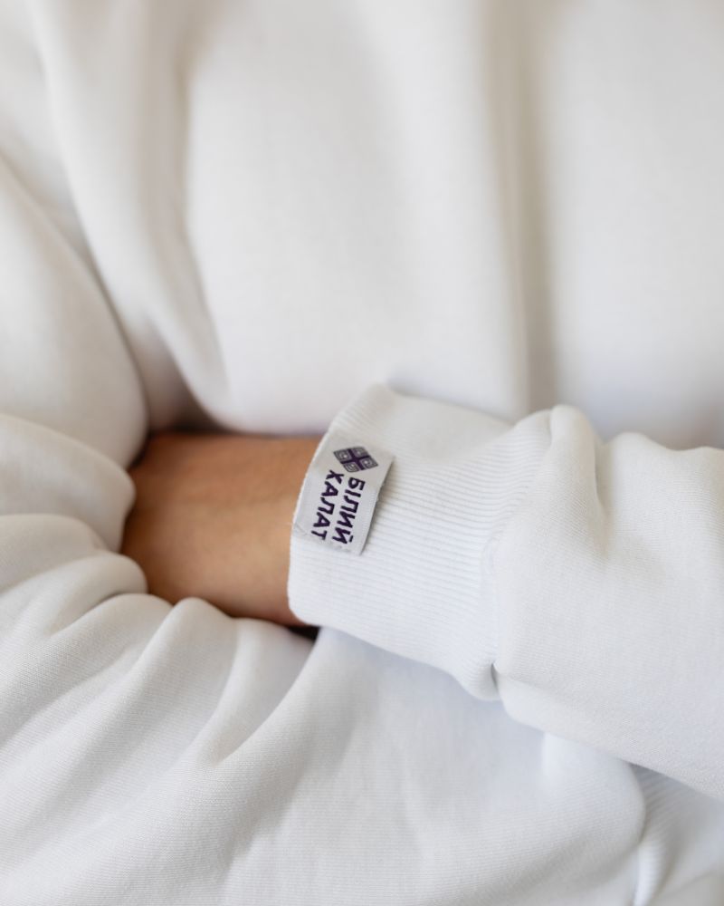 Свитшот свободного силуэта с круглым вырезом, длинные рукава с опущенным плечом на манжете, низ кофты на манжете, на левом рукаве пришита жаккардовая бирка с логотипом.