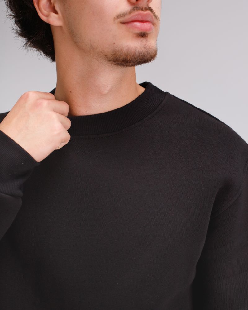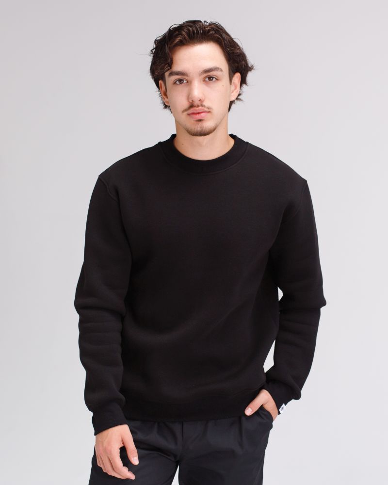 Свитшот свободного силуэта с круглым вырезом, длинные рукава с опущенным плечом на манжете, низ кофты на манжете, на левом рукаве пришита жаккардовая бирка с логотипом.
