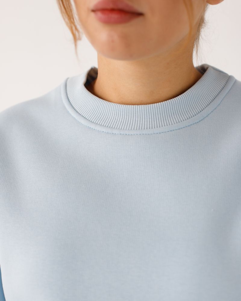Свитшот свободного силуэта с круглым вырезом, длинные рукава с опущенным плечом на манжете, низ кофты на манжете, на левом рукаве пришита жаккардовая бирка с логотипом.