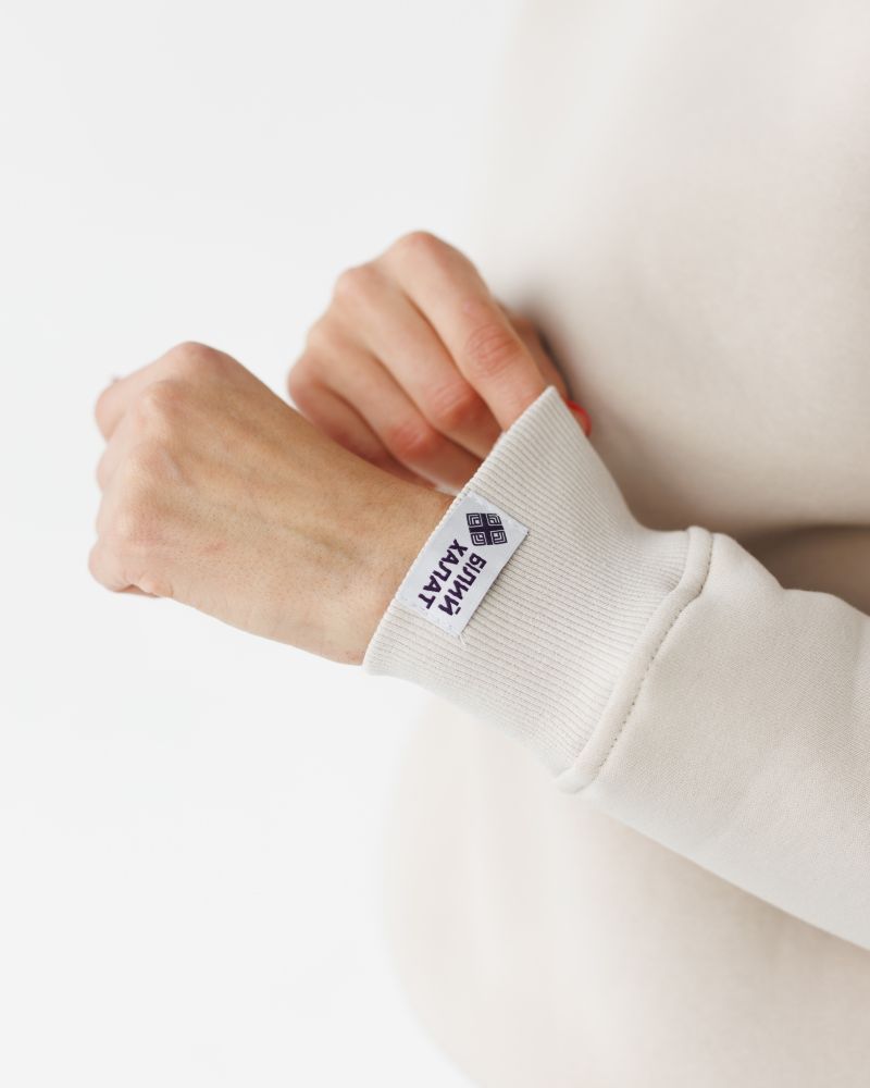 Свитшот свободного силуэта с круглым вырезом, длинные рукава с опущенным плечом на манжете, низ кофты на манжете, на левом рукаве пришита жаккардовая бирка с логотипом.