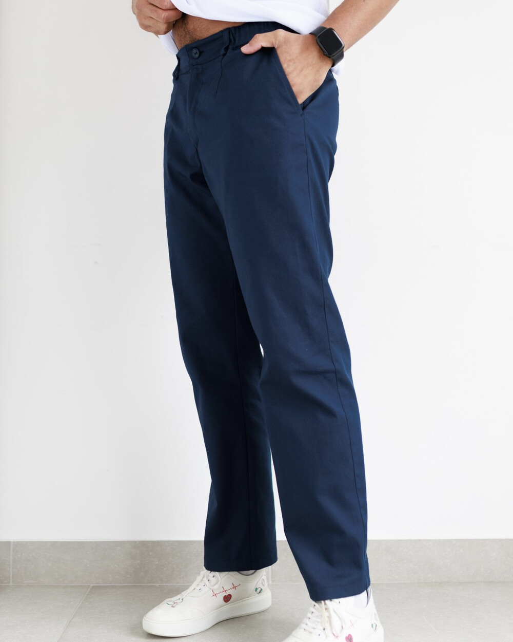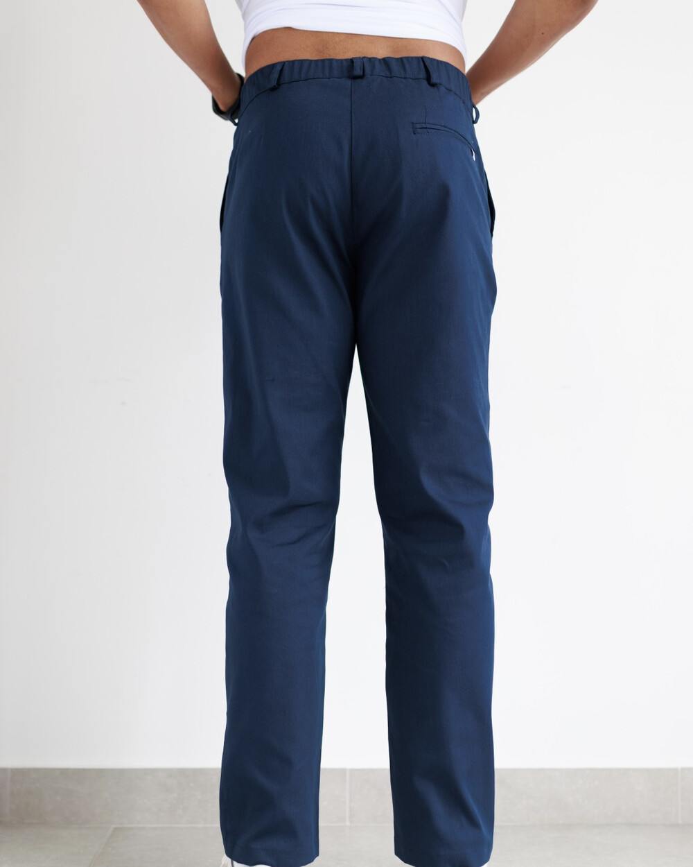 Брюки прямого силуэта, центральная застежка с молнией, на поясе — хомут под ремень, есть карманы. Сзади в верхней части — отрезная кокетка и прорезной карман.