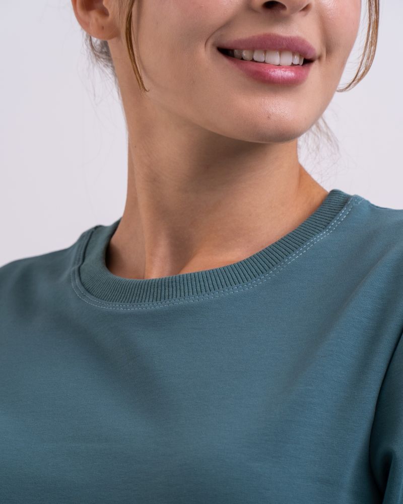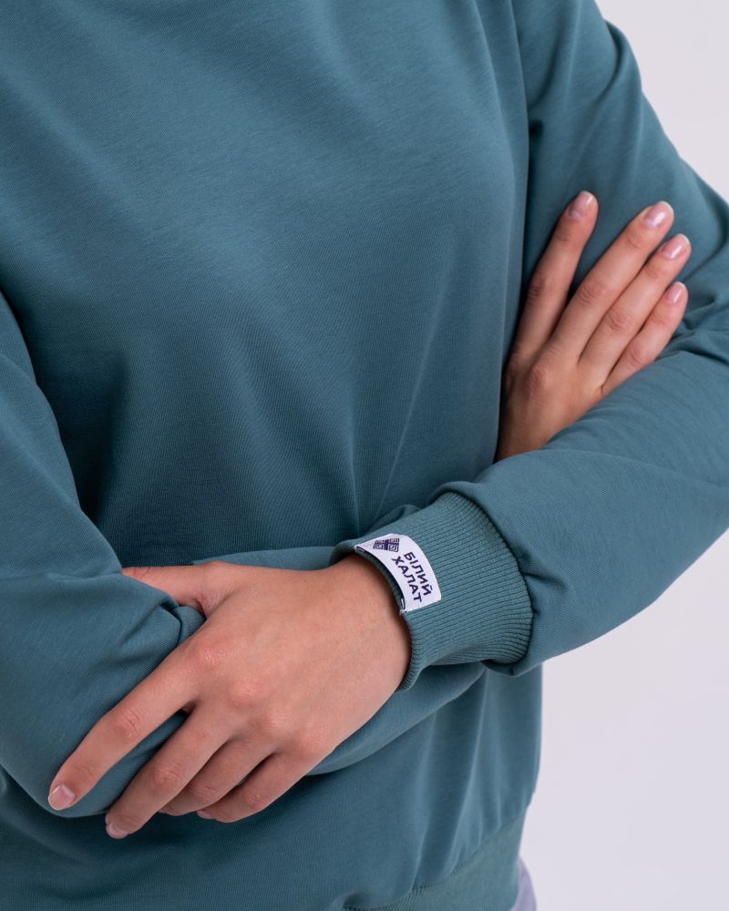 Кофта-свитшот в размере oversize изготовлена в свободном фасоне из трикотажного полотна трехнитка. В составе 95% хлопка и 5% эластана. Материал приятен на ощупь и хорошо пропускает воздух. Рукава, горловина и низ свитшота обрамлены эластичной рибаной, благодаря чему кофту легко надевать и комфортно носить. На левом манжете расположена бирка с вышитым фирменным логотипом.