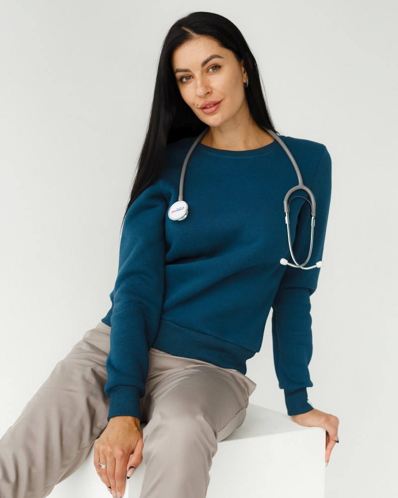 Женские утепленные свитшоты Аляска подойдут для приема пациентов, проведения плановых процедур, длительных изменений и даже для посещения профильных медицинских конференций. Он приятн тактильно, хорошо сохраняет тепло и отводит влагу, держит форму, не ограничивает движений.