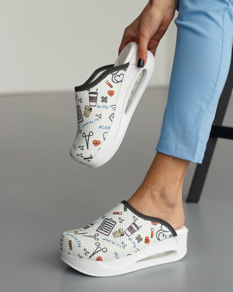 Сабо медицинские с подошвой AirMax — это наверное, самый удобный, практичный и популярный вариант медицинской обуви. Медицинская обувь сабо имеет широкую закрытую верхнюю часть с объемным носком, в котором пальцы ног свободно двигаются. Подошва AirMax довольно высокая, но при этом очень легкая, не ограничивает движений и позволяет комфортно чувствовать себя, находясь целый день на ногах. Медицинские сабо с подошвой AirMax предпочитают врачи и мастера красоты, которые ходят зрительно выглядеть выше, или любят носить обувь на высокой удобной платформе.