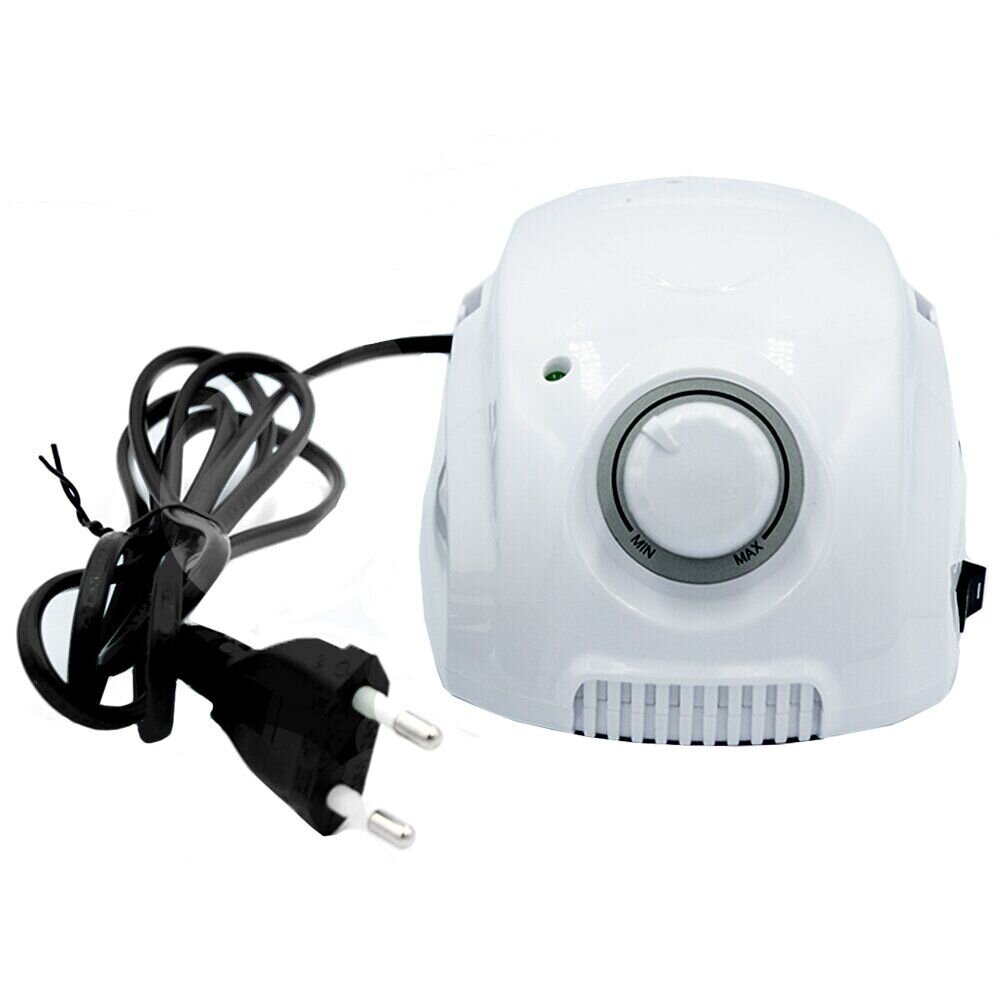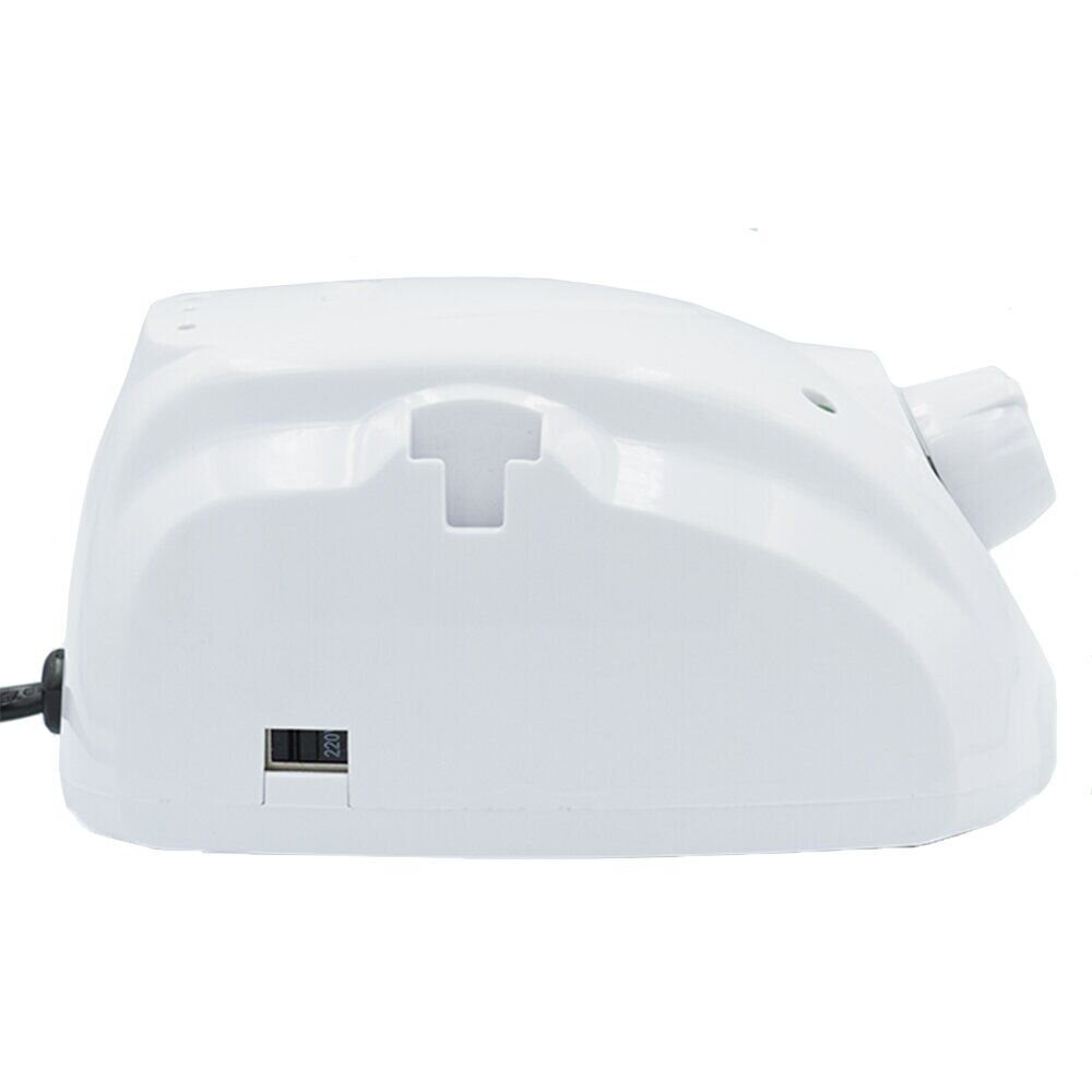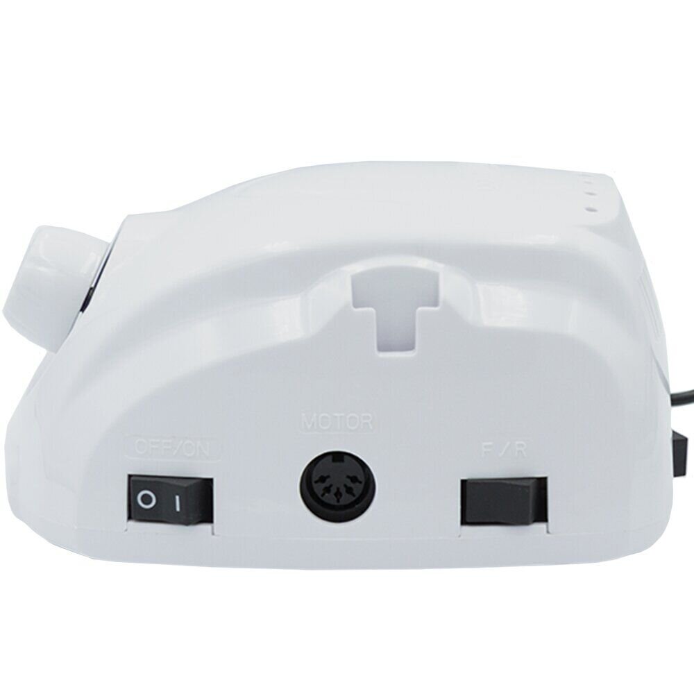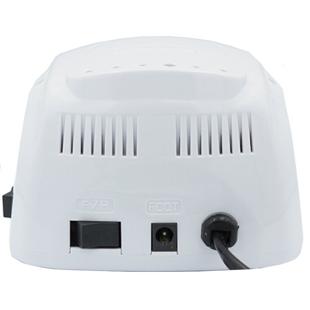 Лампочка-индикатор, расположенная спереди, при включении блока начинает светиться. Отверстия с задней стороны выполняют функцию охлаждения и не дают аппарату для маникюра перегреваться. Прорезиненные ножки обеспечивают устойчивость и плотный контакт с рабочей поверхностью. Сбоку предусмотрен съемный колпачок-держатель для ручки.