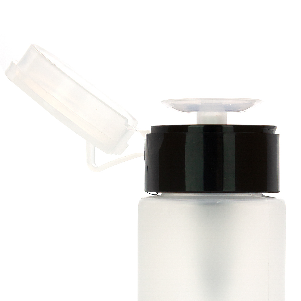 При нажатии, жидкость легко выдавливается наверх, смачивая ватный диск или безворсовую салфетку. Это делается одной рукой, не переворачивая и не открывая-закрывая бутылочку, что значительно экономит время мастера. Удобная крышечка герметично закрывает флакон, не позволяя находящемуся в бутылке составу проливаться или испаряться. Бутылка устойчива к различным веществам.