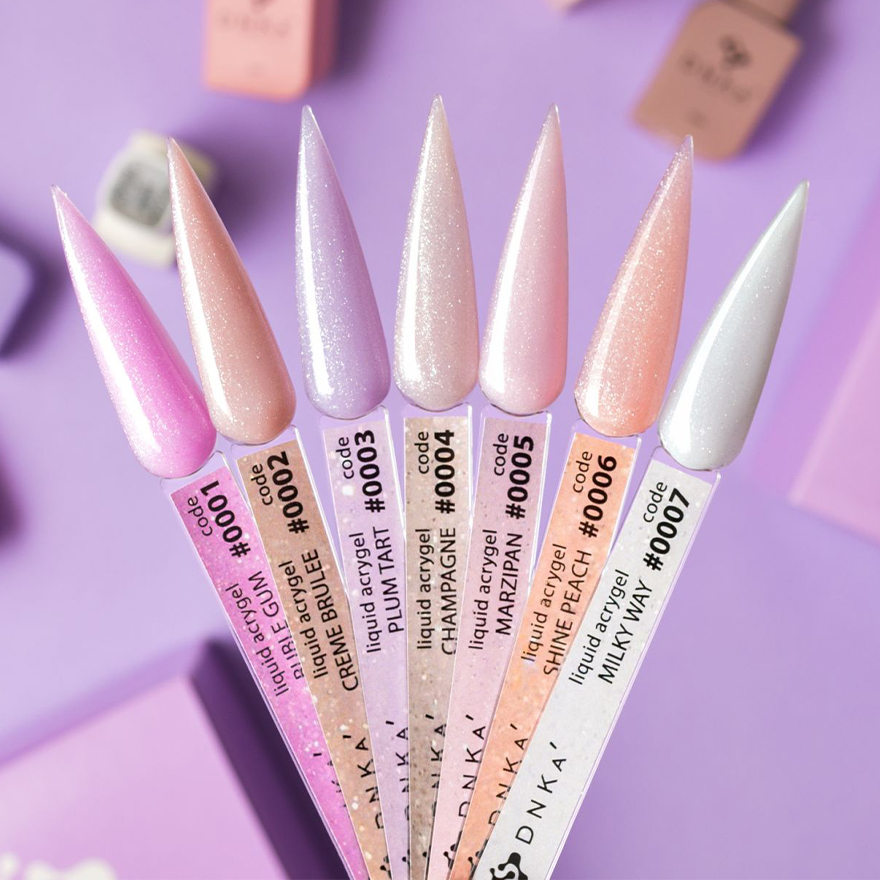 DNKa' Liquid Acrygel – это коллекция жидких гелей, предназначенных для укрепления ногтевой пластины. Благодаря низкому уровню кислотности, жидкий акригель абсолютно безопасен для ногтей. Подходит для тонких и чувствительных ногтей и имеет среднюю консистенцию. Он отлично выравнивает и укрепляет как короткие, так и длинные ногти. Гель не деформируется во время носки и сохраняет идеальный блеск до коррекции. Для лучшего сцепления с ногтевой пластиной рекомендуется использовать DNKa' Rubber Base в качестве подложки, нанесенной тонким слоем.