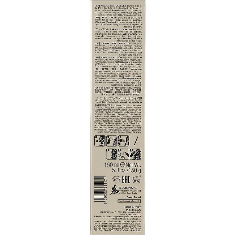 Крем для волос «10 в 1» бренда Elgon – несмываемый DD-крем в виде спрея с уникальным и многофункциональным действием. Его тщательно продуманный состав обогащен комплексом REDOXINA®2.0, протеинами шелка, витамином Е и экстрактом аспалатуса, действия которых направлены на улучшение состояния локонов. Постоянный уход за прядями с помощью этого косметического средства поможет предотвратить износ их кератиновой структуры, а также защитить волосы от ломкости и сухости.