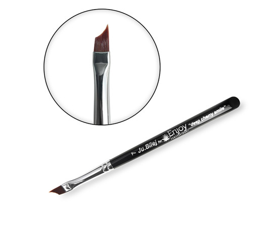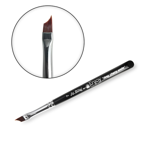 Кисть для линии улыбки Enjoy by Ju.Bilej Deep Cherry Smile #7Новинка для мастеров маникюра: эксклюзивные кисти Ju.Bilej от завода Roubloff, созданные специально для Enjoy Professional. Это авторская, запатентованная разработка мастера международного класса Юлии Билей. Кисти изготовлены из качественного ворса и древесины, служат долгие годы. Кисть Deep Cherry Smile #7 идеальна для прорисовки глубокой ровной линии френча. Рабочая зона кисти широкая, плоская и длинная, кисть используют для работы с длинным свободным краем ногтевой пластины. Кисть изготовлена из синтетического ворса вишневого цвета, поэтому мастеру легко работать с гель-лаком или акриловой краской и контролировать материал при нанесении. У кисти необычная скошенная форма — «салонная улыбка» — скруглена внутрь, что позволяет прорисовать идеальную улыбку френча. Кисть можно использовать для создания других крупных элементов в дизайне: лепестки, листья и узоры в стиле гжэль.Кисть набита плотно, ворс не выпадает, не оставляет полосы, не набирает большое количество материала, что позволяет сделать работу более аккуратной. Ручка кисти изготовлена из дерева, не скользит и удобно лежит в руке.Длина ворса: 10 мм
