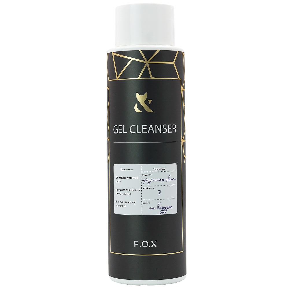F.O.X Cleanser - это жидкость для удаления дисперсионного (липкого) слоя, который образуется после полимеризации в лампе искусственного материала. Завершающий этап в работе с гелевым покрытием.