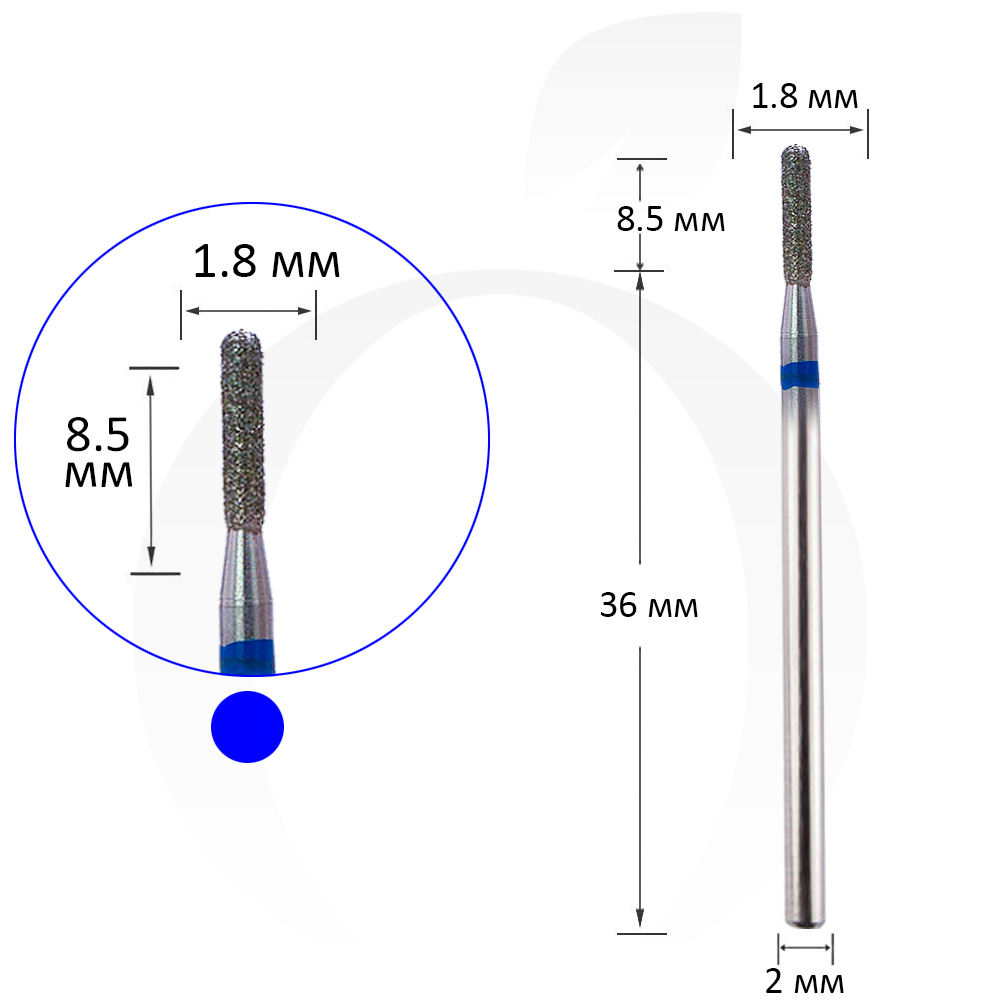 Фреза алмазная цилиндр закругленный синяя 1.8 мм, рабочая часть 8.5 мм