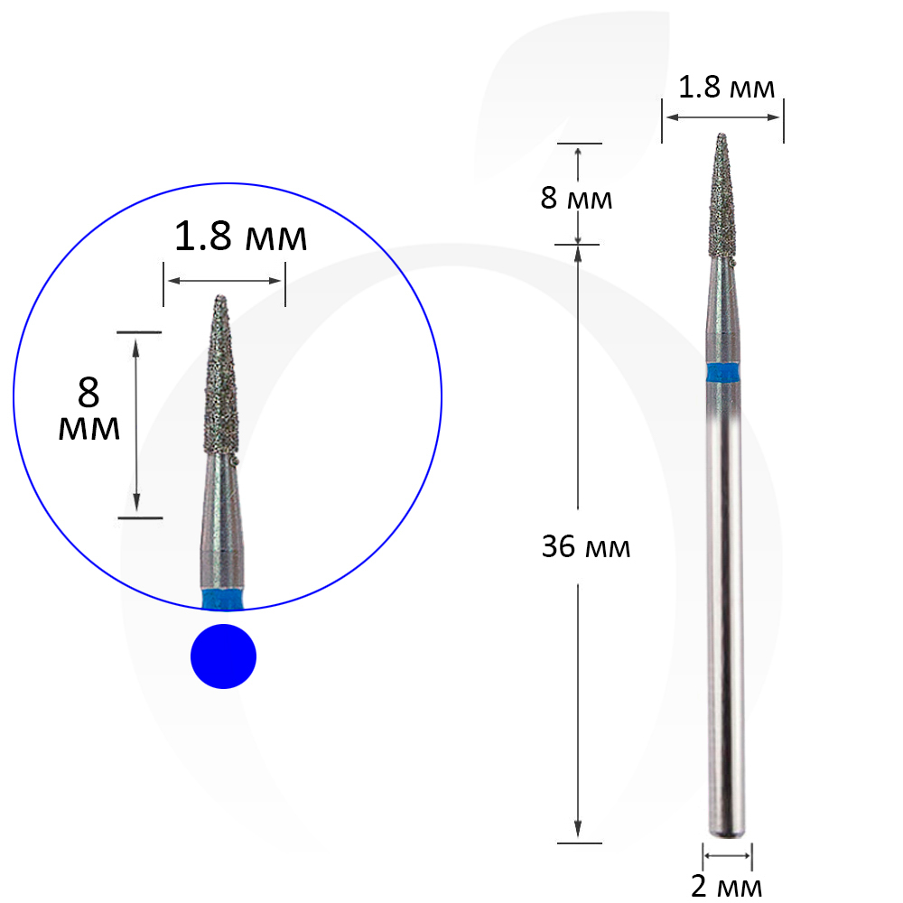 Фреза алмазная конус синяя 1.8 мм, рабочая часть 8 мм
