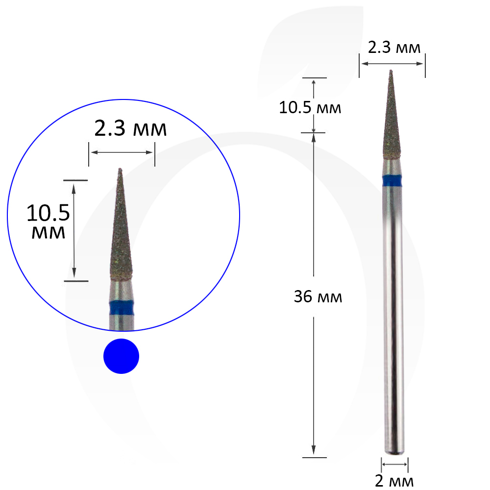 Фреза алмазная конус синяя 2.3 мм, рабочая часть 10.5 мм