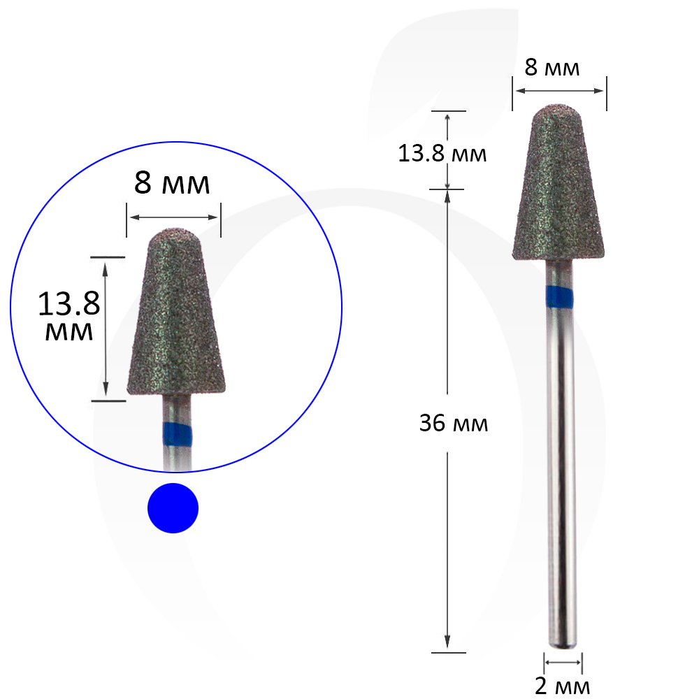 Фреза алмазная конус закругленный синяя 8 мм, рабочая часть 13.8 мм