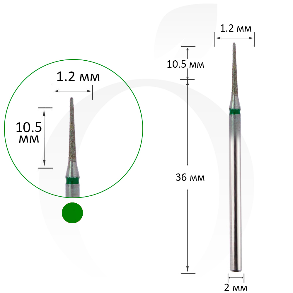 Фреза алмазная конус зеленая 1.2 мм, рабочая часть 10.5 мм