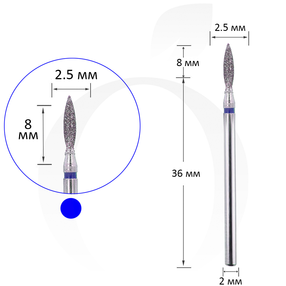 Фреза алмазная пламя синяя 2.5 мм, рабочая часть 8 мм