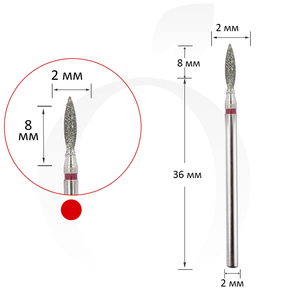 Фреза алмазная пламя красная 2 мм, рабочая часть 8 мм