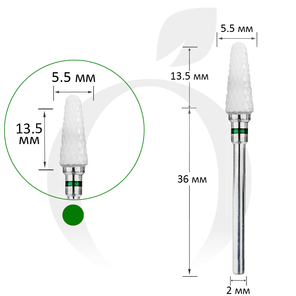 Фреза керамическая конус закругленный зеленая 5.5 мм, рабочая часть 13.5 мм