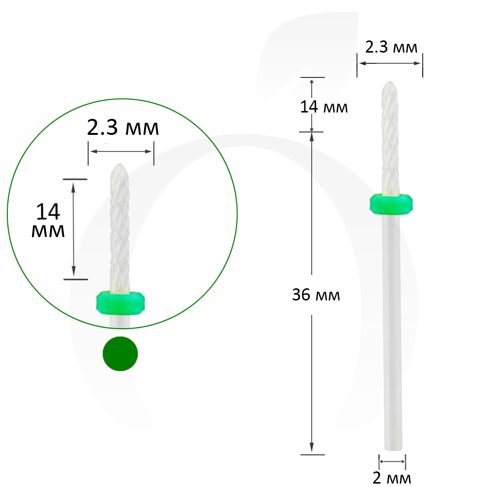 Фреза керамическая игла зеленая 2.3 мм, рабочая часть 14 мм