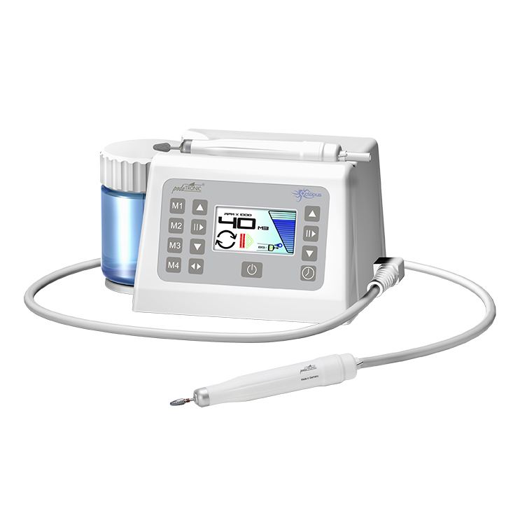 Высокая скорость вращения бесщеточного ручка до 40000 об./мин., что обеспечивает быструю и комфортную обработку стопы. Его вес всего 112 г.Встроенный распылитель. Процедуры становятся более приятными благодаря охлаждающему эффекту от спрея, который уменьшает потребность в использовании скальпелей.