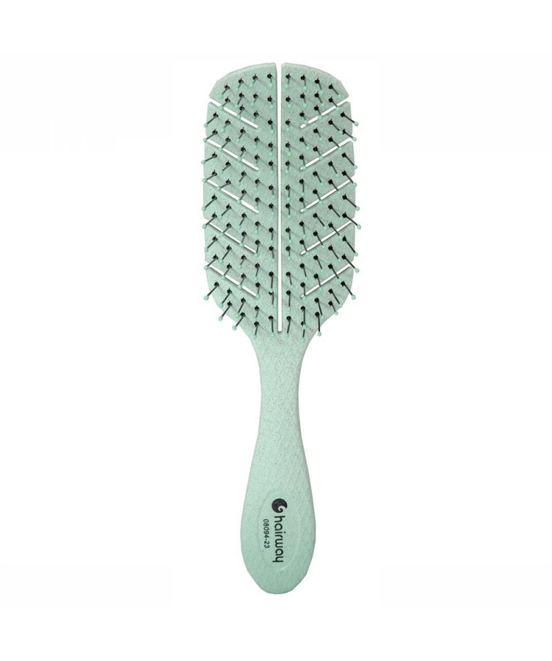 Щетка для волос Hairway ECO Corn изготовлена из волокон пшеницы, кукурузного крахмала, маниоки и смолы. Это натуральное сырье, полностьюбиоразлагается. Нейлоновая щетина позволяет щетке бережно расчесывать волосы. Щетка имеет приятный массажный эффект и не травмирует кожу головы, легко справится смокрыми и взъерошенными волосами.